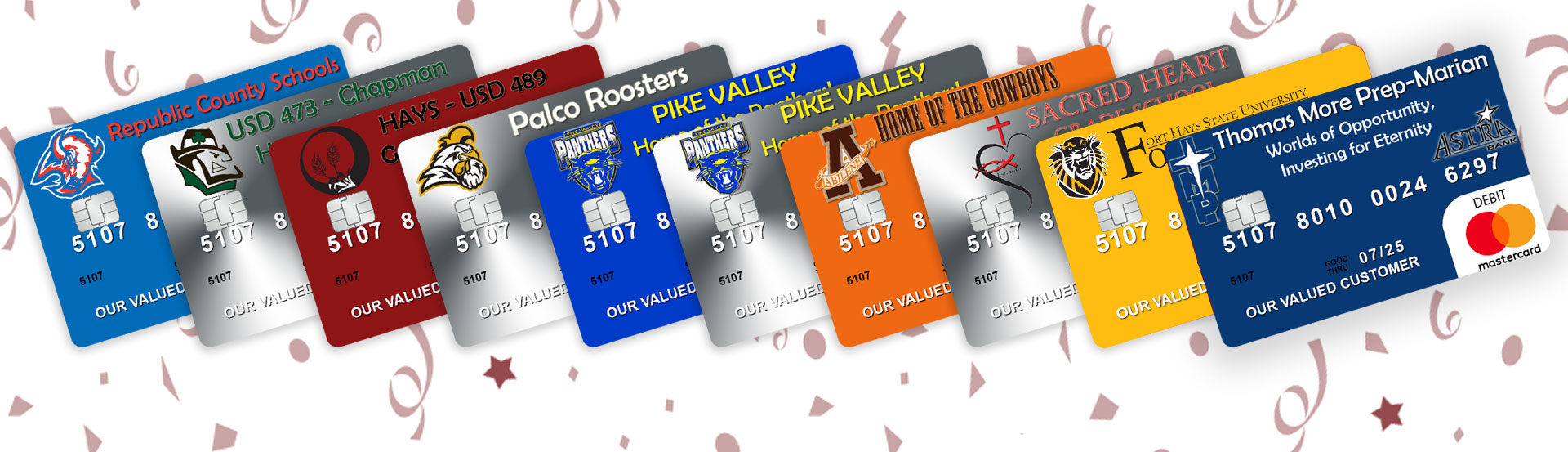 Stop by your local Astra Bank branch for more details and to get your card today. The schools (and what their card looks like) are shown below.